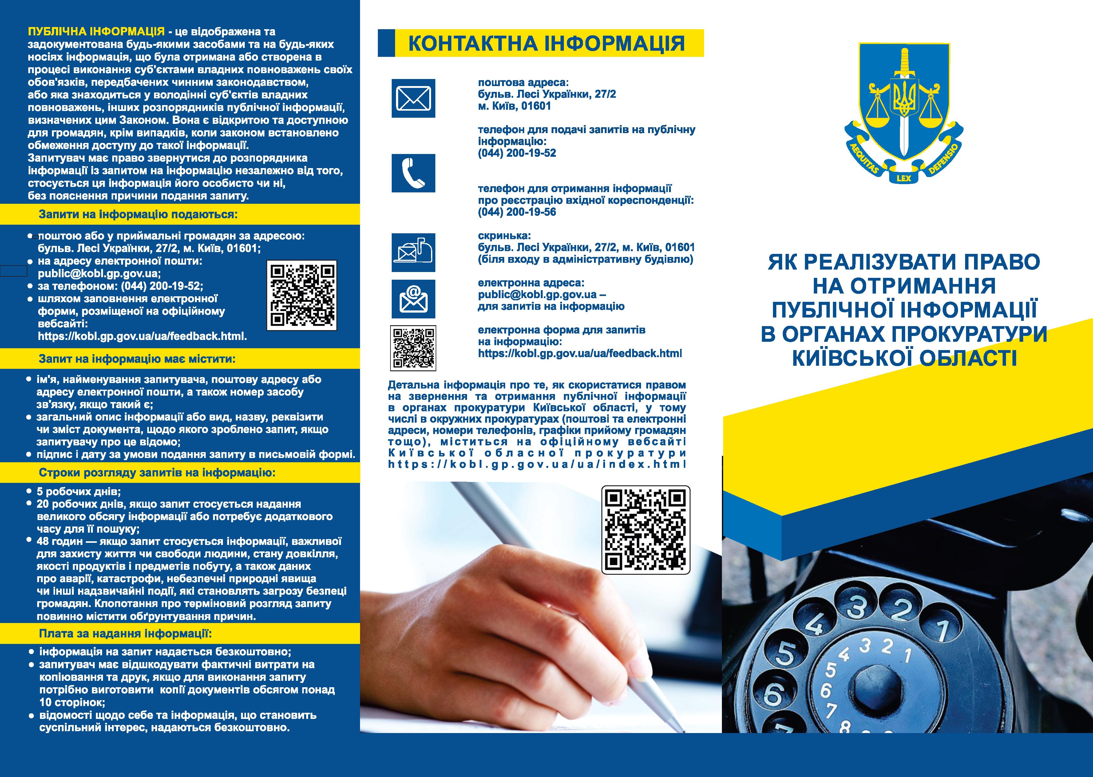 З метою спрощення процедури оформлення письмових запитів на інформацію розроблено Форму для подання запиту на отримання публічної інформації, яку можна отримати: в приміщенні «Приймальні громадян» Київської обласної прокуратури (адреса: бульв. Лесі Українки, 27/2, місто Київ, 01601) або завантажити на даному вебсайті.